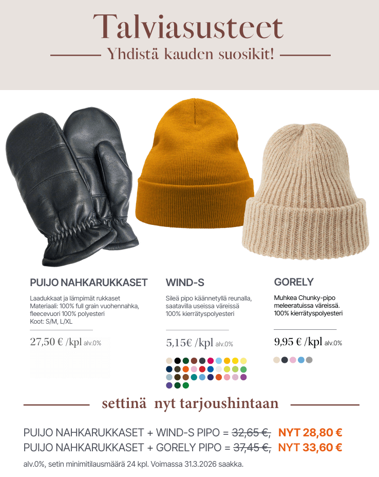 Henkilöstölle talven pakkasiin laadukkaat Puijon Nahkarukkaset settinä joko Atlantiksen Wind-S pipon tai Atlantiksen Gorely -pipon kanssa. Tarjous rukkaset ja Wind-S pipo yhteensä 28,80 eur/kpl tai rukkaset + Gorely pipo yhteensä 33,60 eur/kpl. Hinta alv 0%.